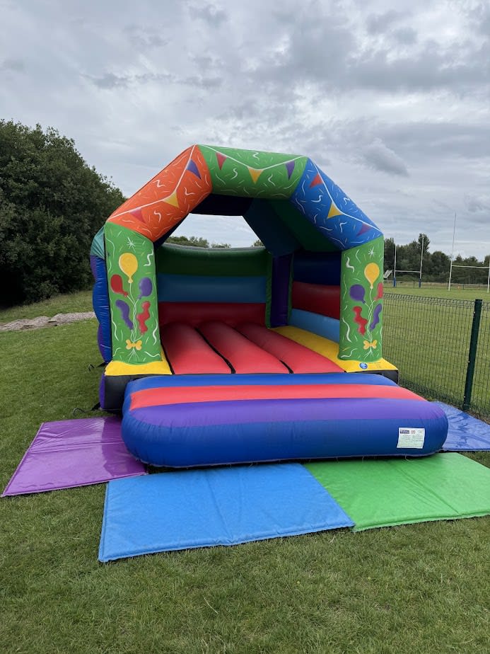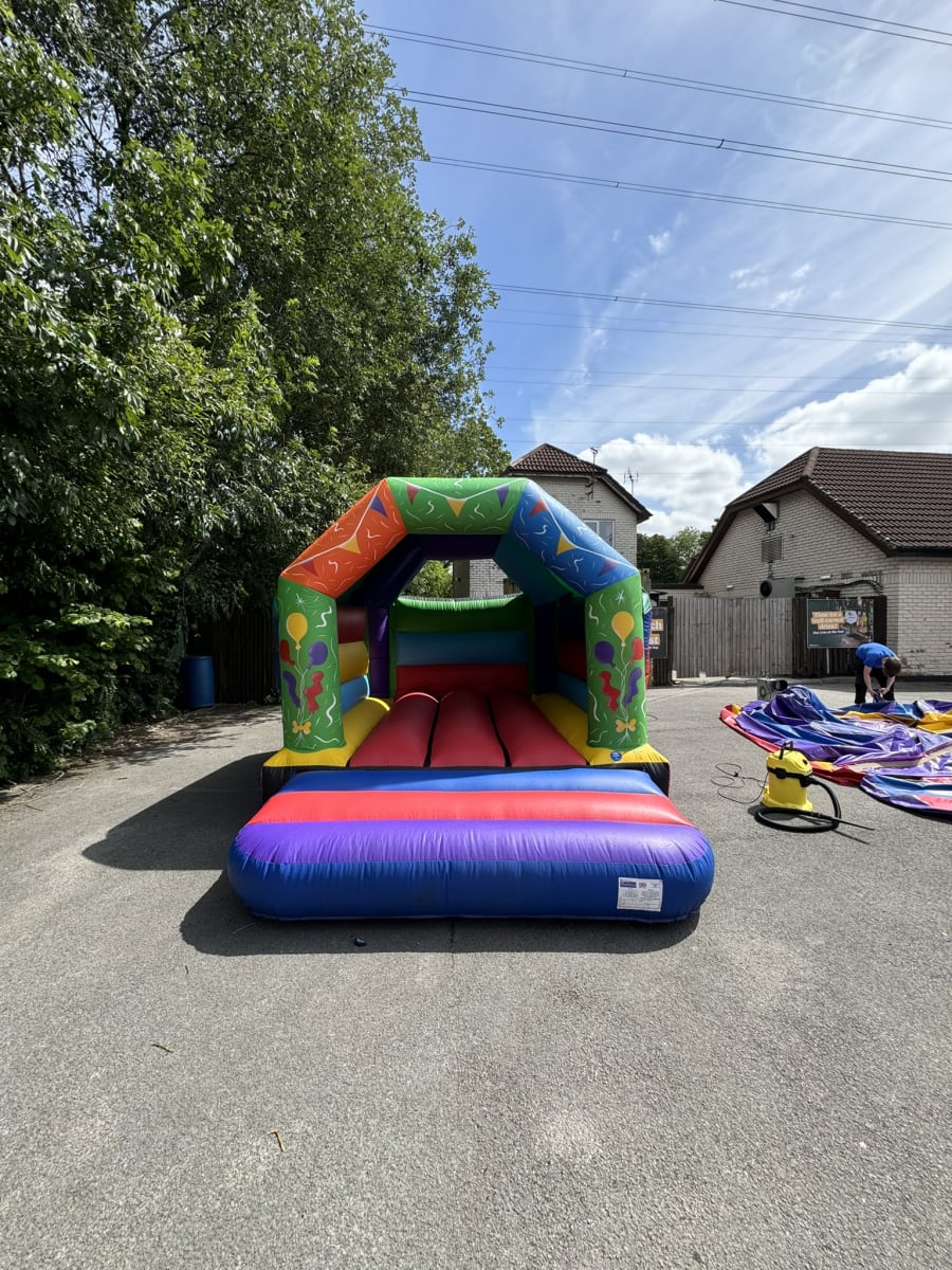 Our Party Theme A-Frame Bouncy Castle is one of our most popular and versatile inflatables. Designed with bright balloons, confetti and colourful party graphics, it suits absolutely any type of celebration — from children’s birthdays and school events to indoor hall parties and family gatherings across Bolton, Bury and Manchester.