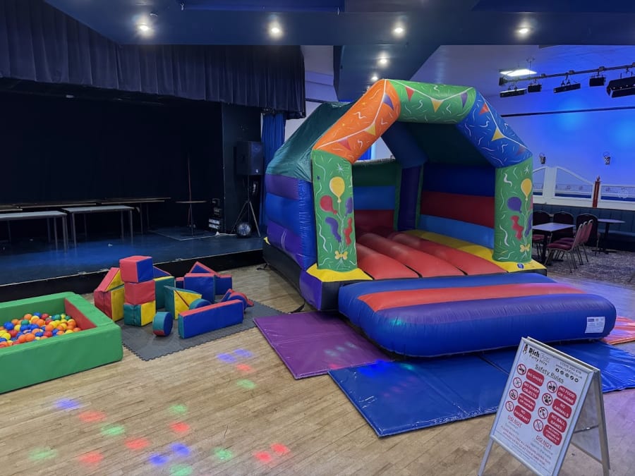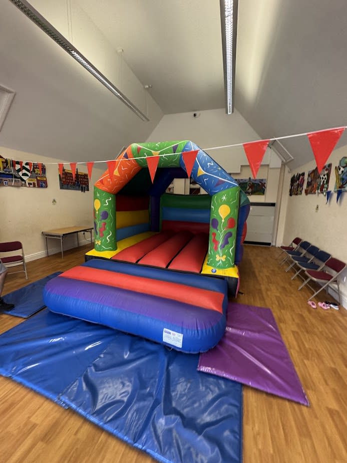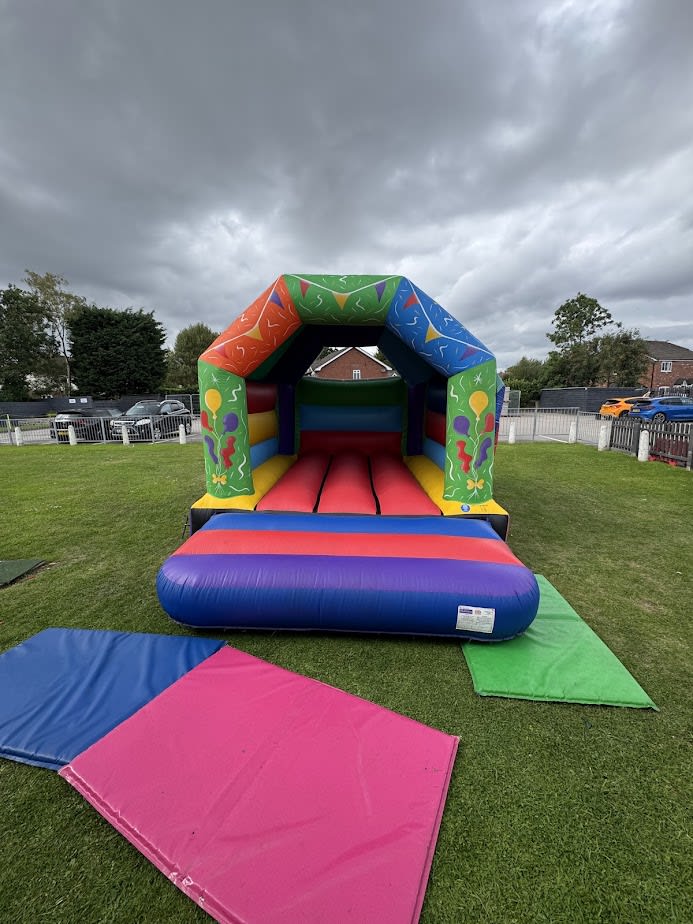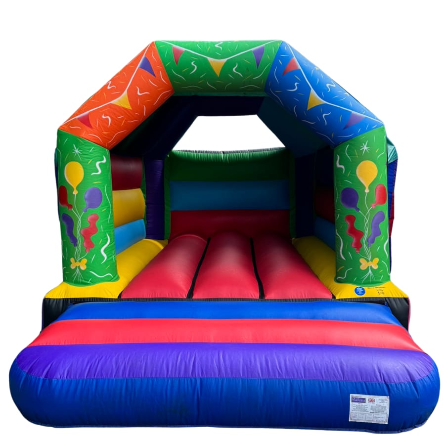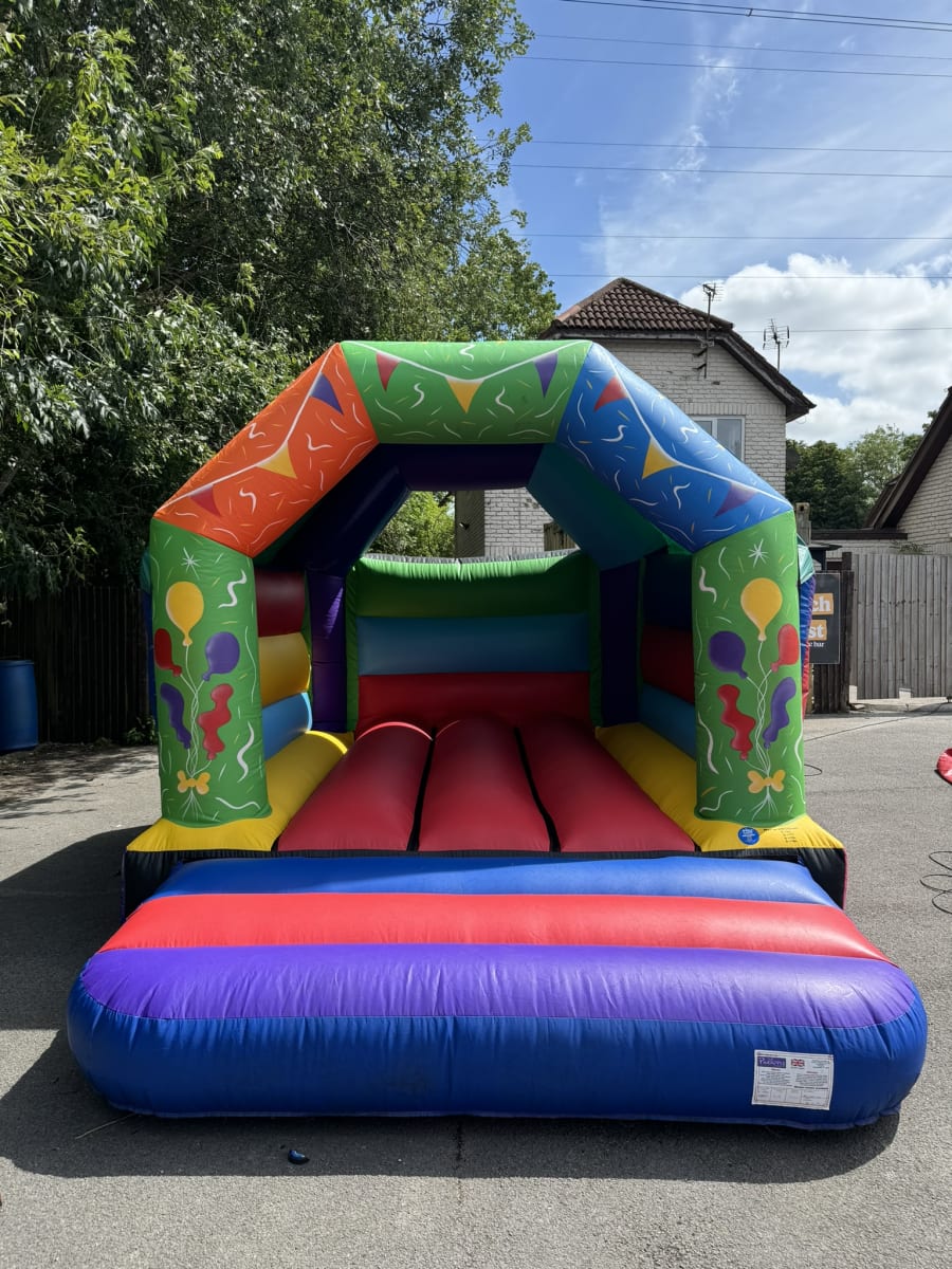 Our Party Theme A-Frame Bouncy Castle is one of our most popular and versatile inflatables. Designed with bright balloons, confetti and colourful party graphics, it suits absolutely any type of celebration — from children’s birthdays and school events to indoor hall parties and family gatherings across Bolton, Bury and Manchester.